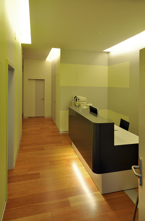 In der klein bemessenen Praxis in der Berner Altstadt wurde ein zusätzlicher Behandlungsraum installiert. Der Wartebereich musste in die Mitte - und damit weg von der Fassade gerückt werden. Mit viel Technik (Klima, Akustik, Elektroinstallationen), einer stimmigen Lichtführung und einer grafischen Farbgebung konnte dieser Mangel mehr als kompensiert werden.