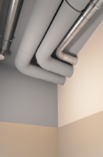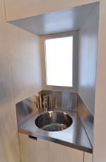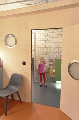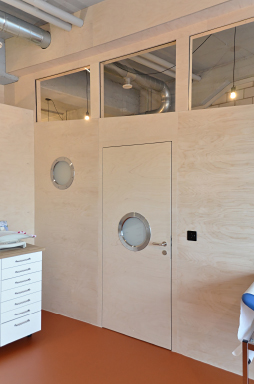 Der ca 100 m2 grosse Bereich ist sowohl horizontal wie vertikal etwas vesetzt - hinauf zur ehemaligen Anlieferungsrampe. In diesen Rohbau wurde ein Volumen aus Holz gefügt, das virtuos eine Wegführung bildet und als ein raumhaltiges Objekt - eine Art Möbel oder Schiff - mit den unterschiedlichen Höhen den rohen Raum mit seinen technischen Installationen offen lässt. Auf der Anlieferung oben wurden zwei weitere Behandlungszimmer installiert.