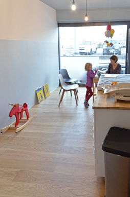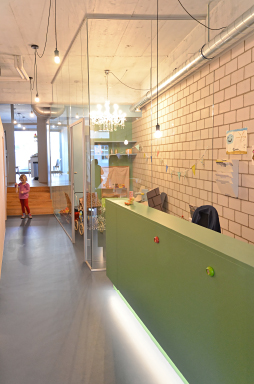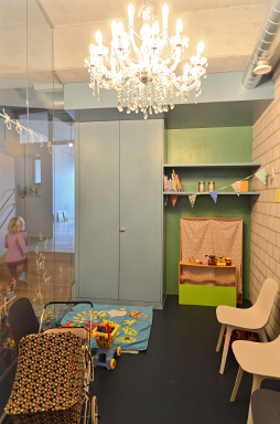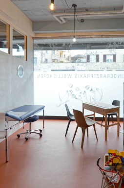 Im Erdgeschoss eines unspektakulären 60er Jahre Gewerbegebäudes wurden in einem ehemaligen Coop Laden 4 neue Geschäftsflächen abgetrennt. In einem dieser „Schnitze“ entstand diese Kinderarztpraxis.